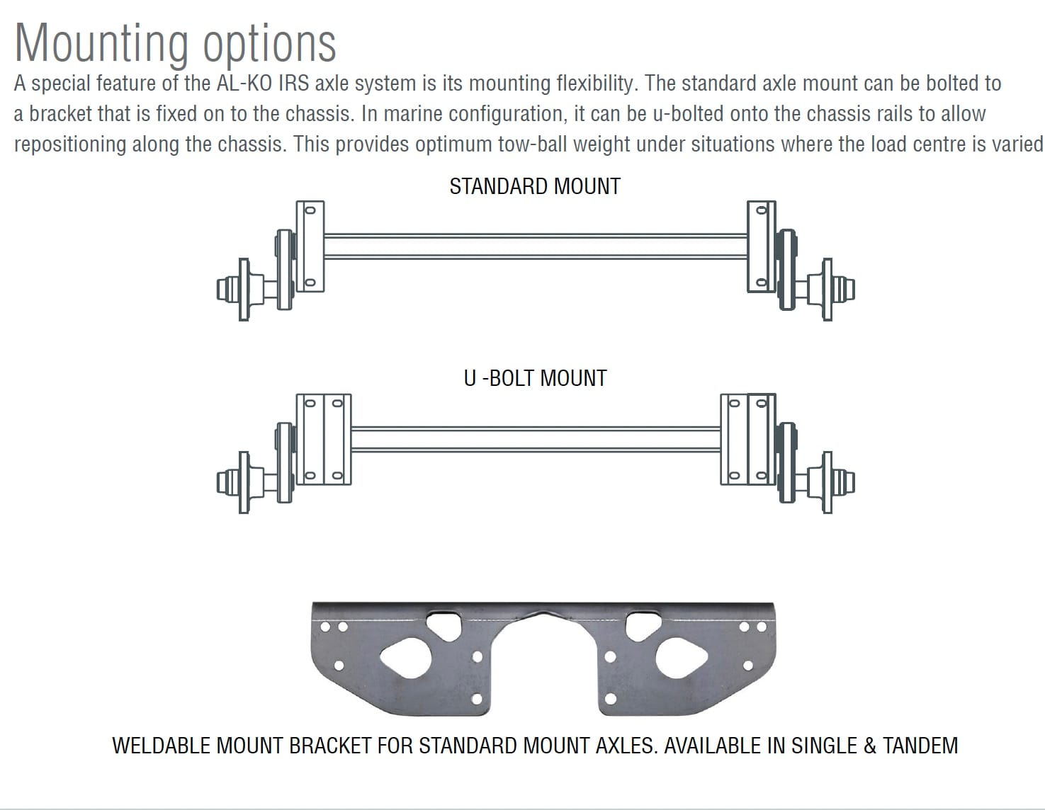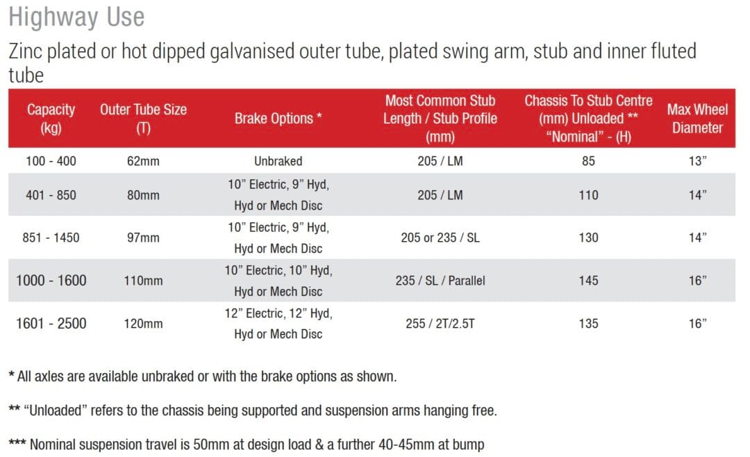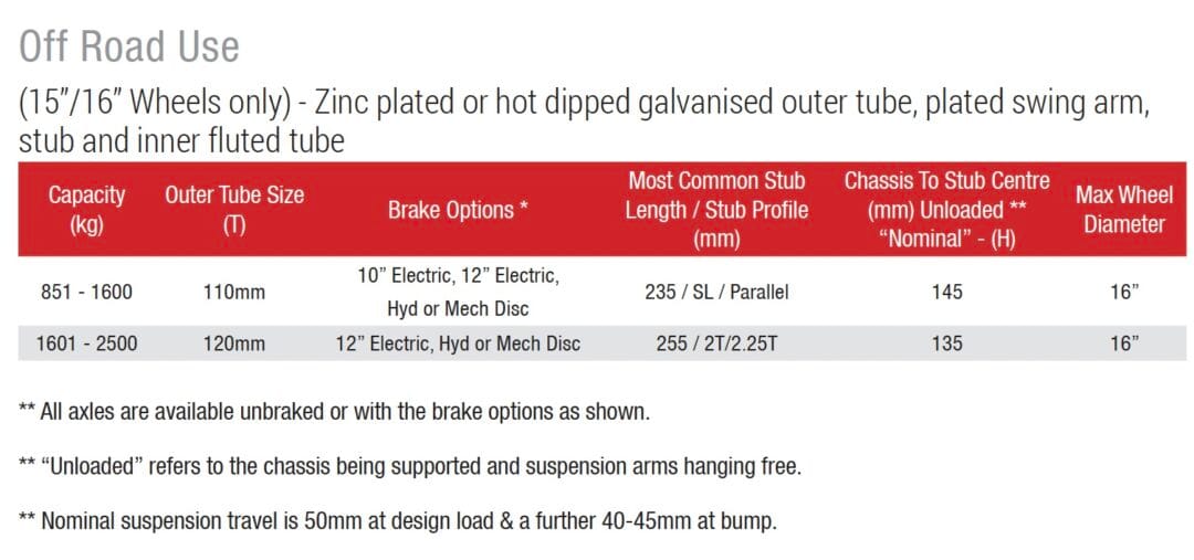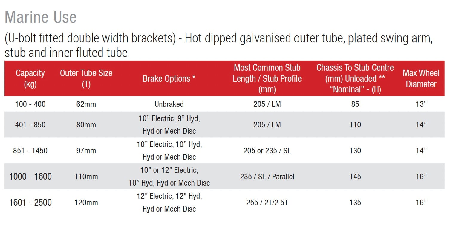 - Galvanised axles available for marine applications.